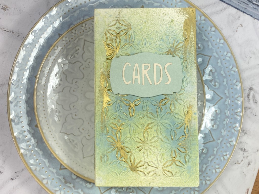 I have been wanting to make a Card Caddy die for a while… so many people are making cards these days that I figured that they would love to have the ability to make a really pretty container to hold them. I love the shape of this box and it goes together so quickly- also fun to decorate! It will hold cards up to 5 1/4″ wide.